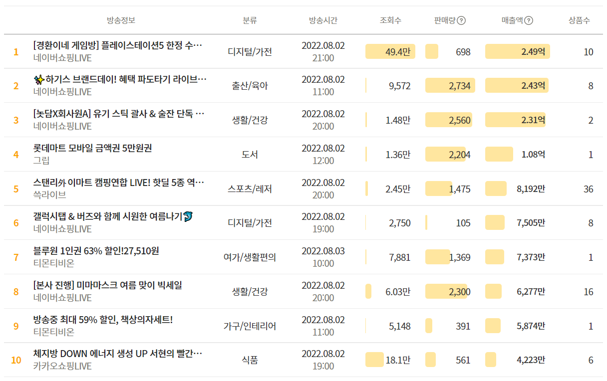 지난 24시간 매출액 기준 TOP 10 입니다. 3위의 '놋담' 이야기를 해볼까 합니다. '놋담' 라방은 약 2,500개의 판매량을 기록하며 2.31억원의 매출을 올렸습니다.