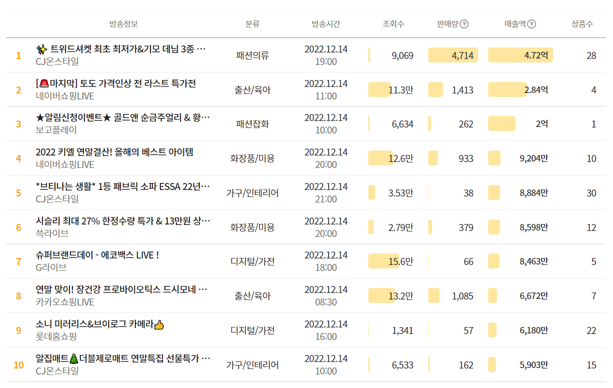 어제의 매출액 TOP10 입니다. 8위의 드시모네 방송은 오전 8시 30분에 방송을 진행했음에도 13.2만의 조회수를 기록했네요.